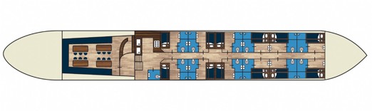 Das Schiff ist luxuriös ausgestattet: Jede Kabine verfügt über eine eigene Dusche und Toilette. Und der Salon hat eine gemütliche Bar und große Fenster, durch die Sie einen fantastischen Blick auf das Wasser und die Umgebung haben.