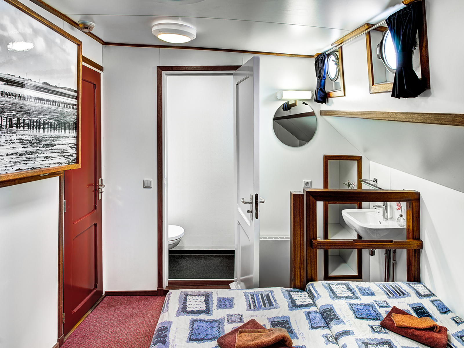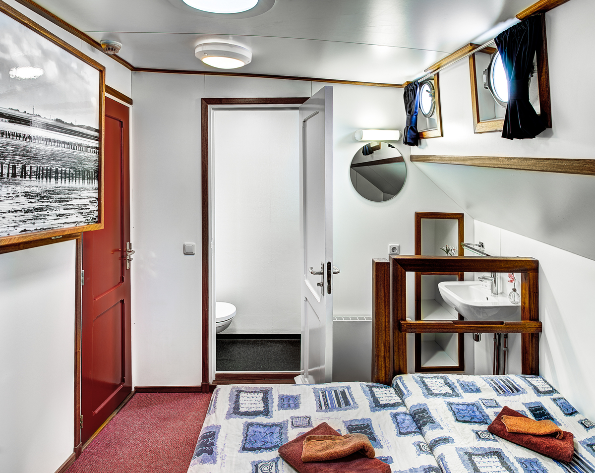 These 10 double cabins all have their own shower and toilet. The beds are next to each other with a stand in between, so that there is plenty of storage space in the cabin as well. In 6 of the cabins, it is possible to place a third bed above one of the beds. In four cabins, a third and fourth bed can be placed above the two lower beds.