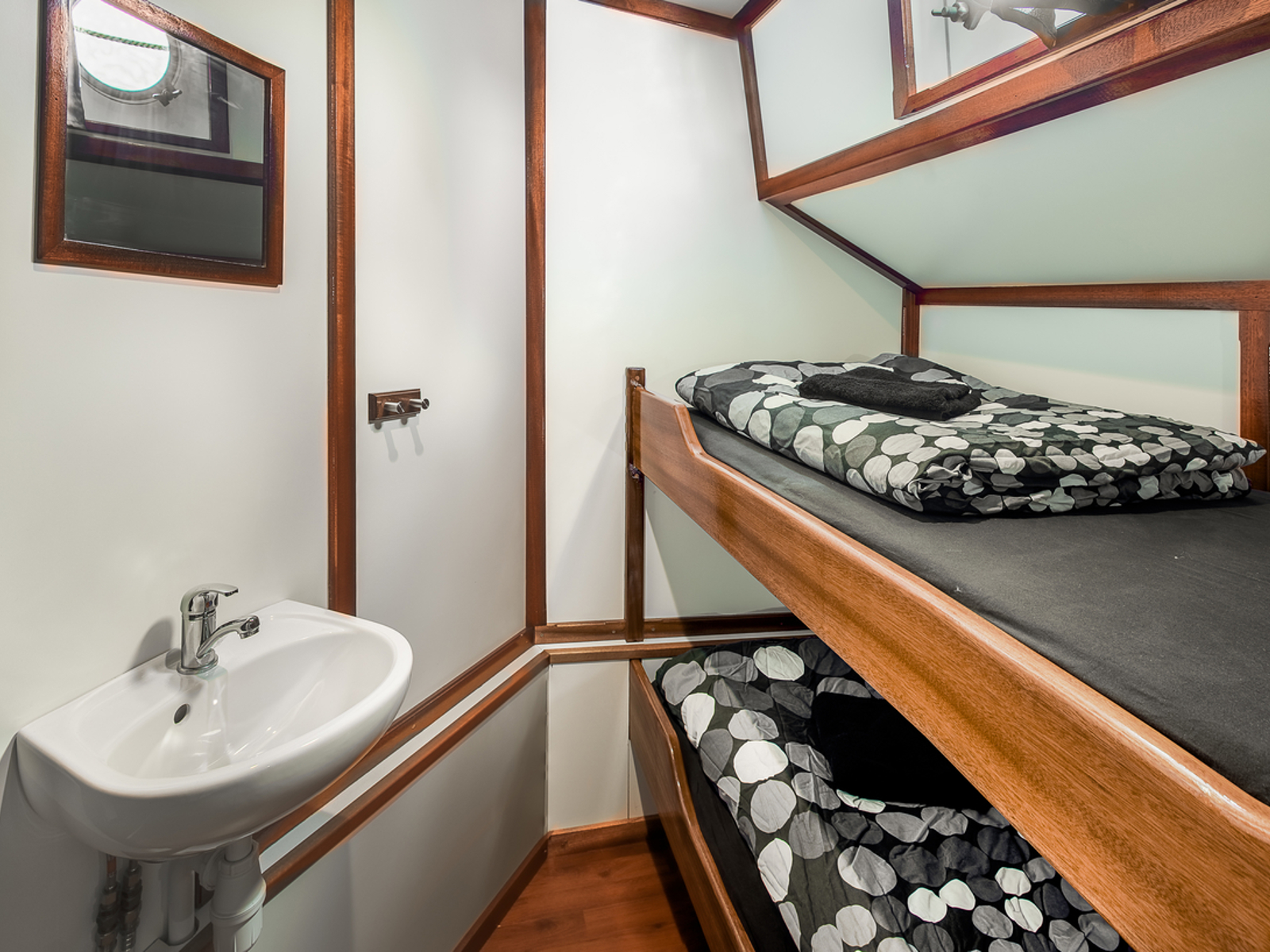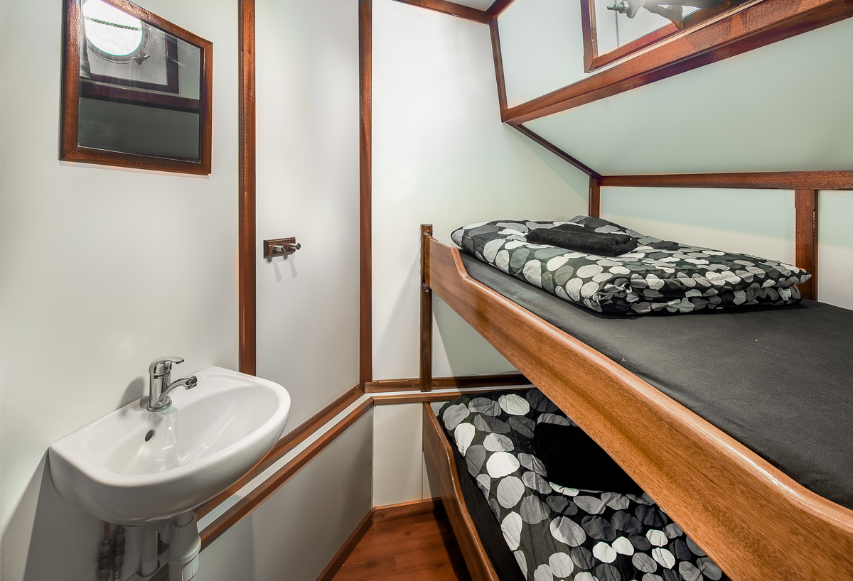 Between the saloon and the sleeping cabins there are three toilets and three showers. The shower rooms offer enough space to hang your clothes up to dry while you shower. At the front of the ship are the twelve sleeping cabins, which are divided into six spacious double cabins, four three-person cabins, and two equally spacious four-person cabins. Each cabin has a sink with hot and cold water, central heating, and an open porthole and/or deck hatch. There is enough space under the beds to store your travel bags.