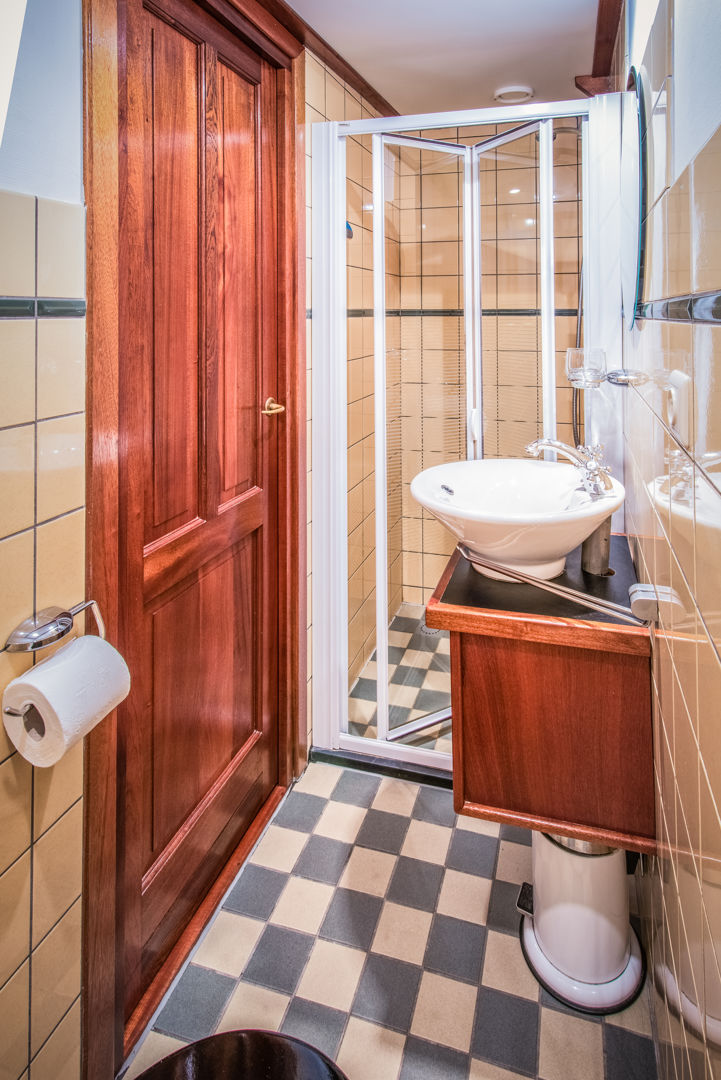 A staircase leads to some of the bedrooms. The other bedrooms are located in the fore ship and can be reached via a staircase in the deck house. The spacious and comfortable rooms are all equipped with two separate box-spring beds, a private shower and toilet, a sink, a hair dryer and a safe. Eight rooms also have a foldup bed. The beds are made upon arrival.
