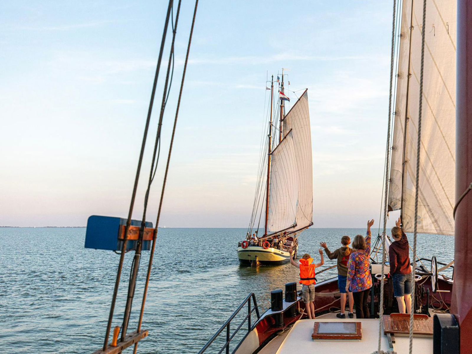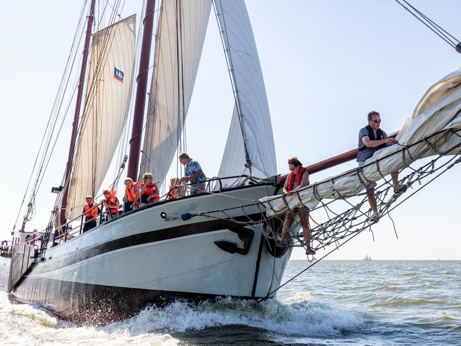De kinderen hebben speelkameraadjes aan elkaar, en de ouders maken het samen gezellig met een hapje en drankje aan dek. We houden het leuk voor de kinderen: dus niet te lang achter elkaar zeilen, en we varen zo dat de kinderen actief mee kunnen helpen – bijvoorbeeld met zeilen zetten en sturen. Zeilen op een groot schip is voor kinderen een enorm avontuur! Als ze met het stuurwiel aan het roer staan, voelen ze zich groeien. Onderweg zien we vanaf het schip vaak zeehonden liggen op de zandbanken van de Waddenzee, lekker in de zon.