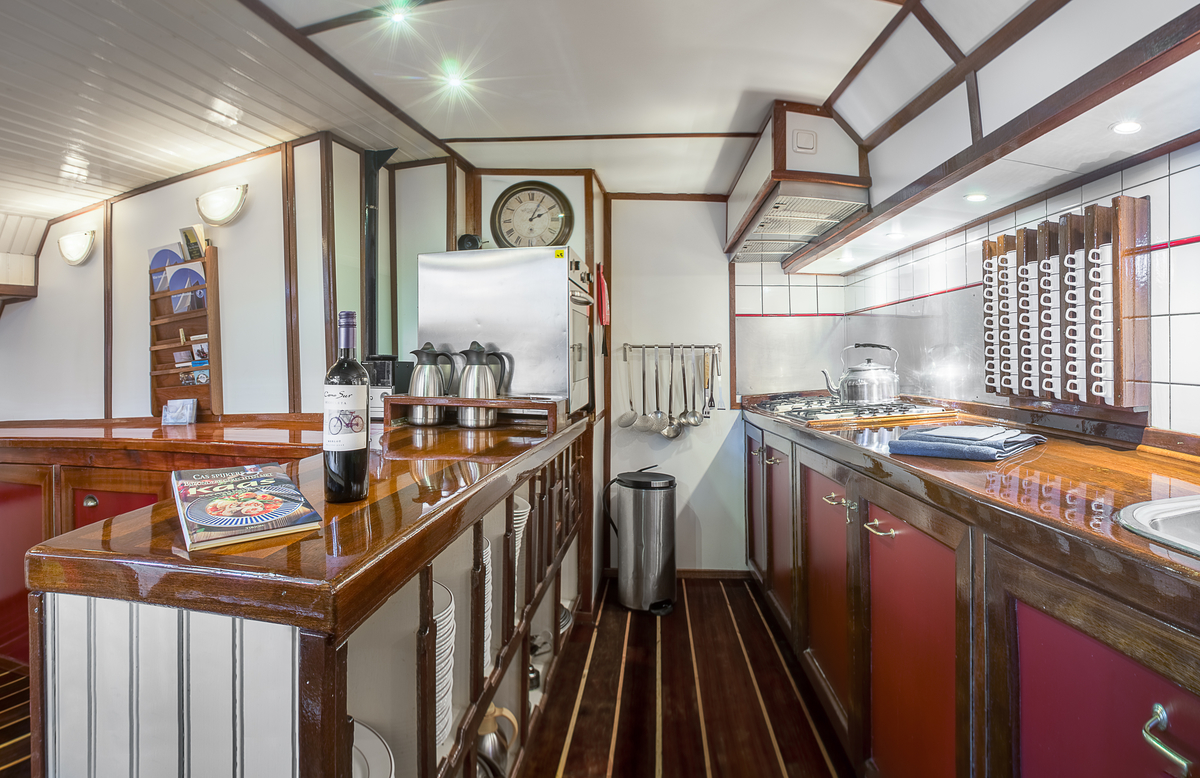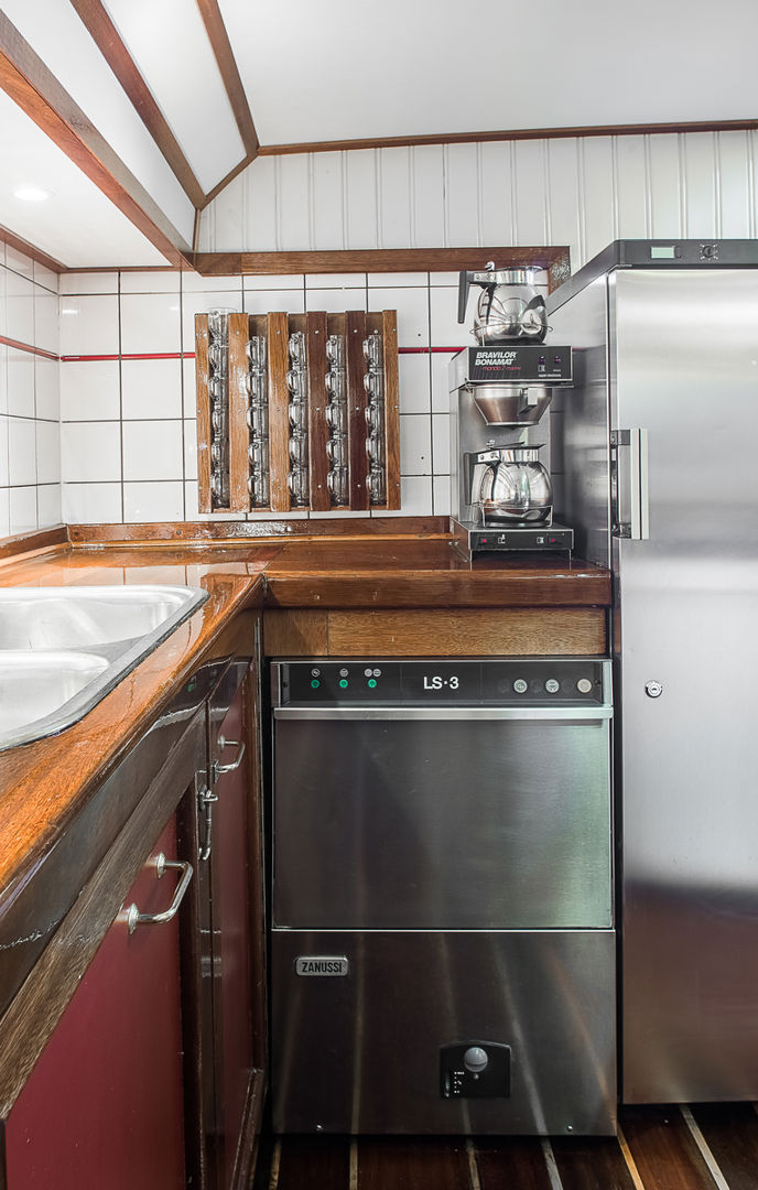 De grote open keuken is bij uitstek geschikt om een heerlijk lopend buffet aan te bieden, of om zelf voor een grote groep gasten te koken. De keuken is voorzien van een 8-pits gasfornuis, een grote koelkast en een Bravilor koffiezetmachine. Naast de keuken bevindt zich de biertapinstallatie.