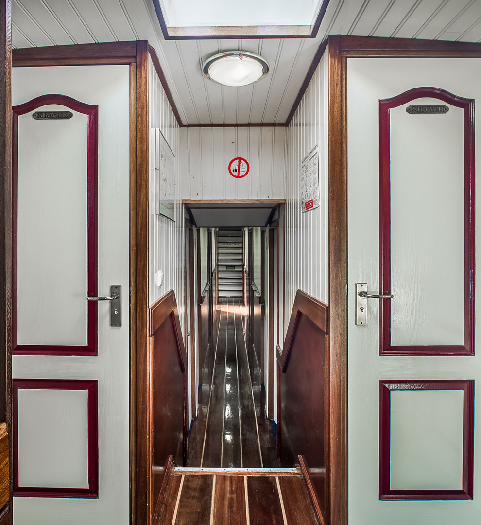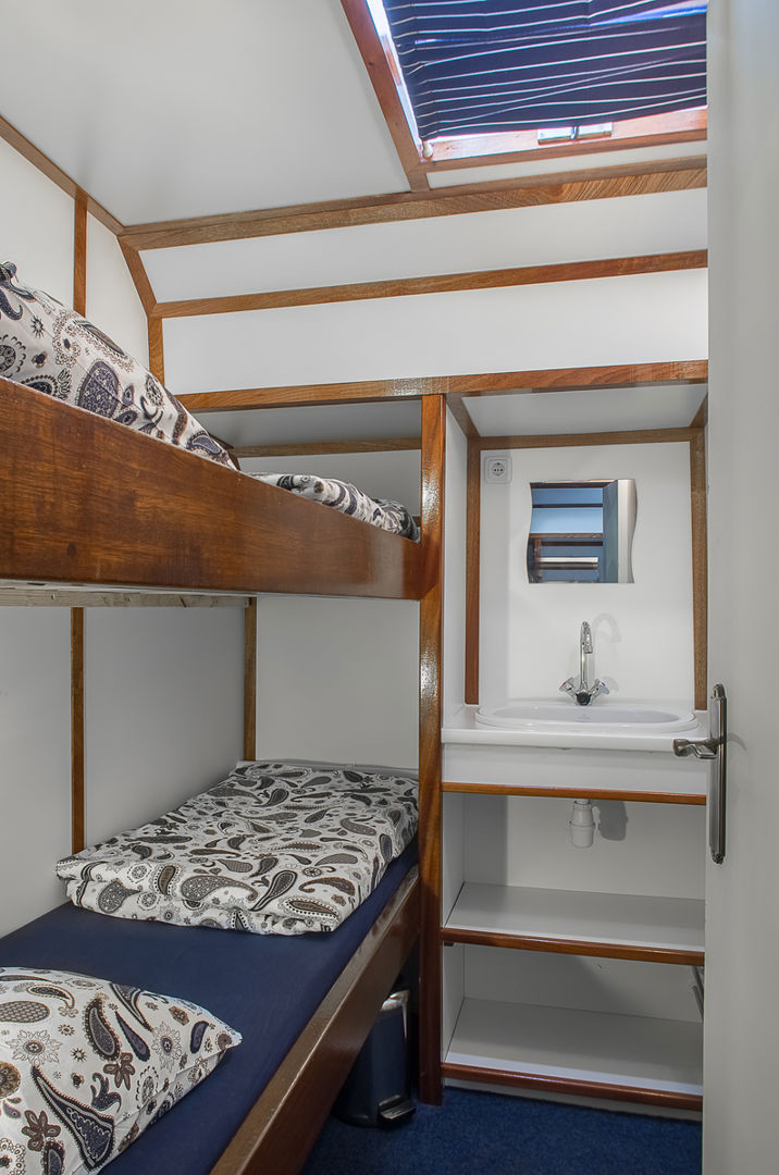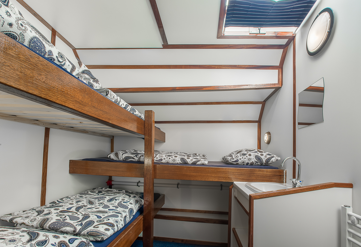 In het voorschip bevinden zich het sanitair en de slaapvertrekken. 8 tweepersoons en 4 driepersoons hutten geven onderdak aan maximaal 28 personen. De hutten hebben allemaal of een patrijspoort of een dekluik. Onder de bedden is voldoende plaats voor het opbergen van de reistassen.