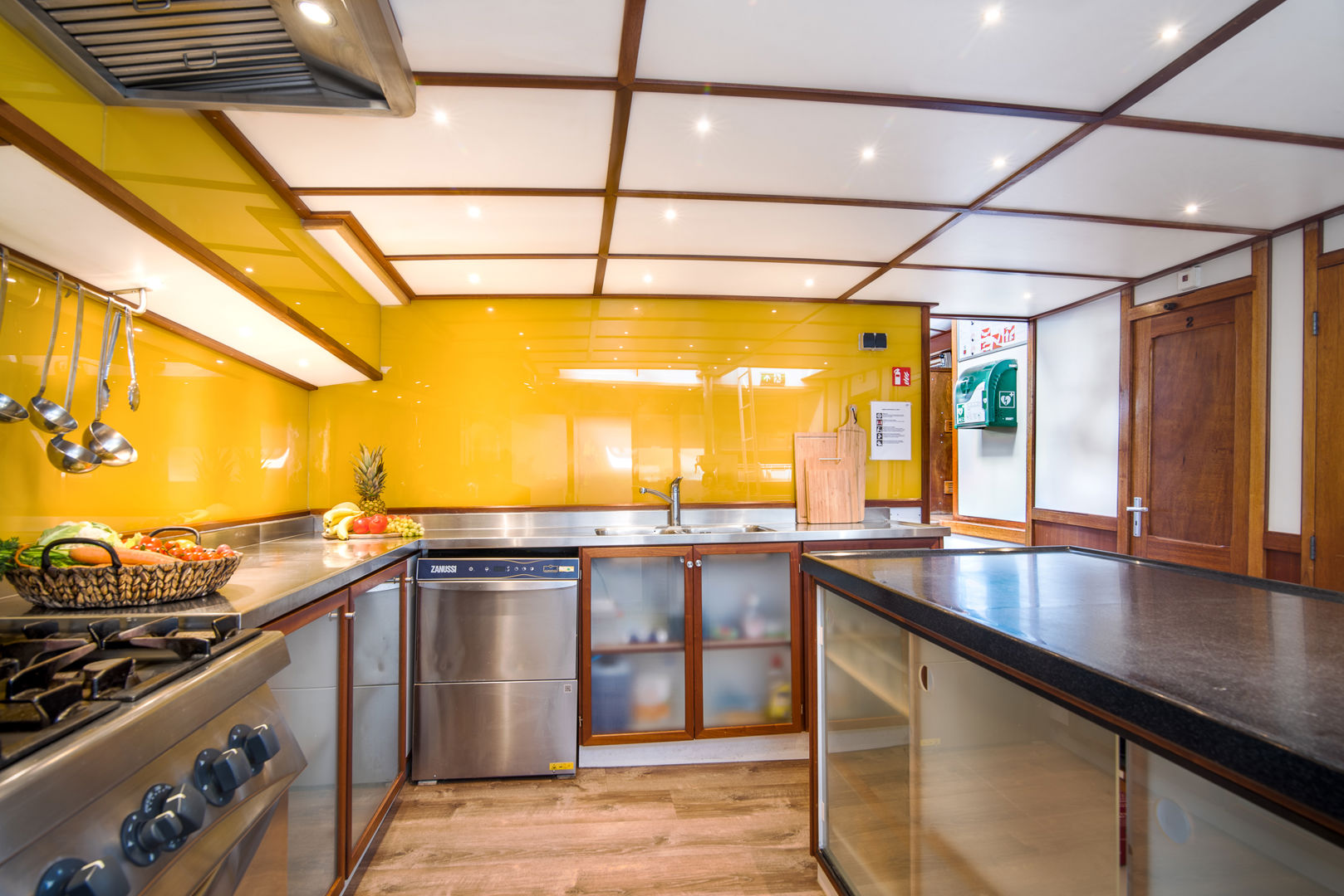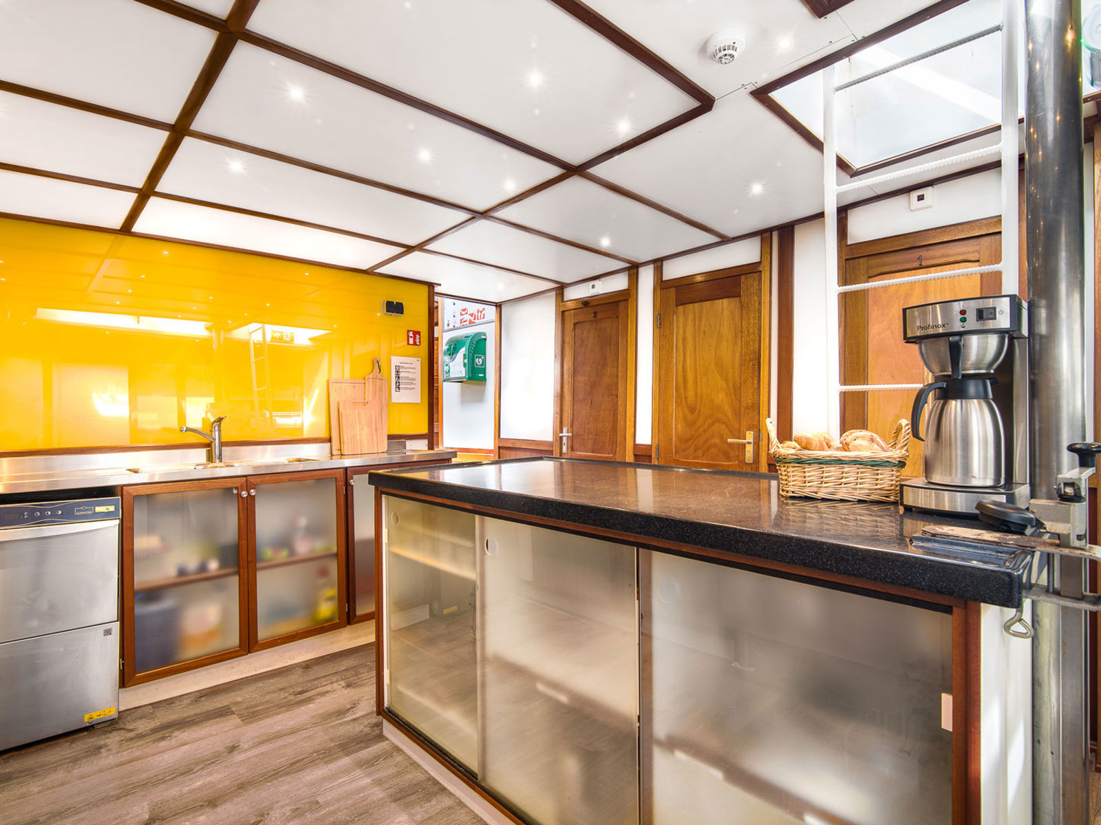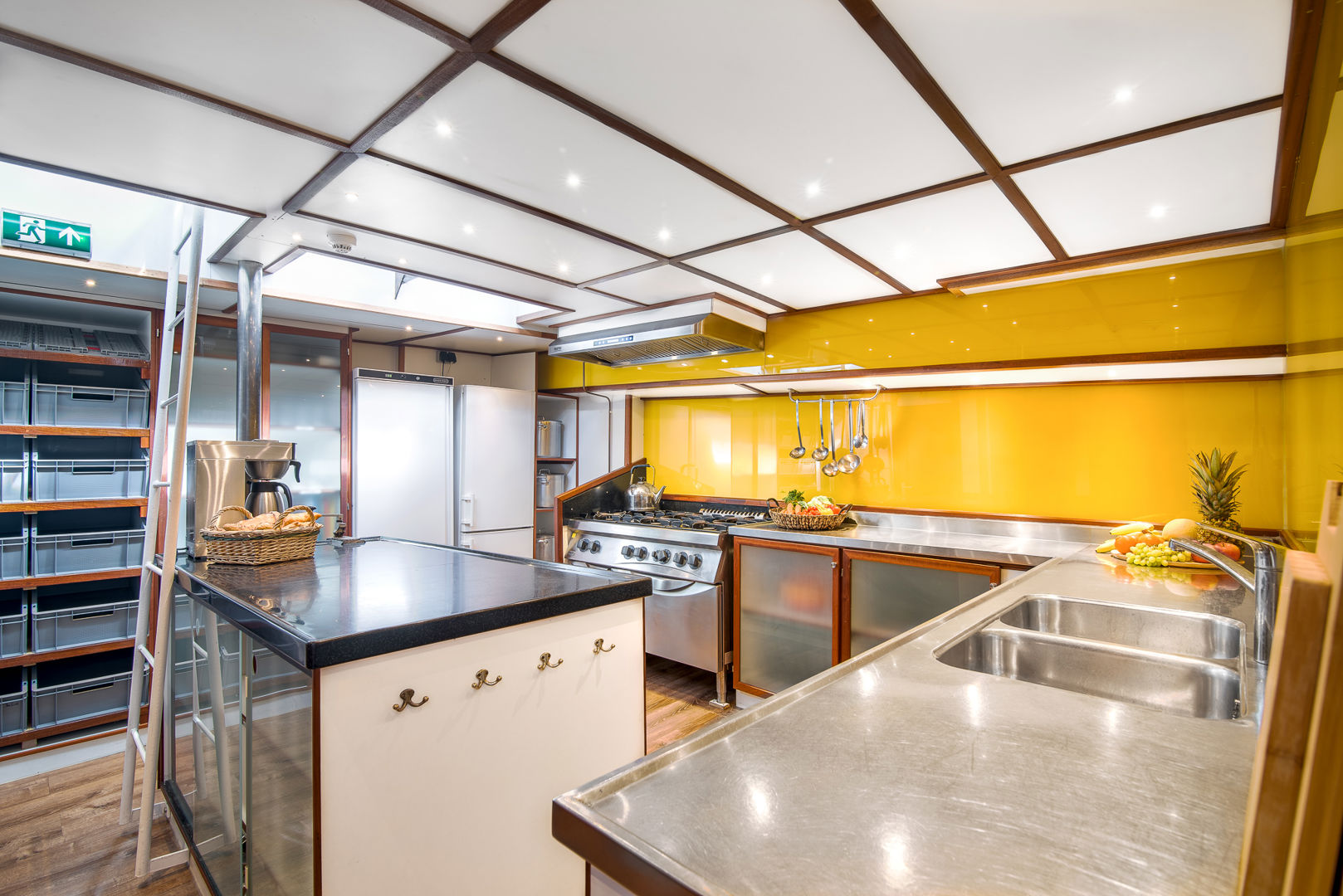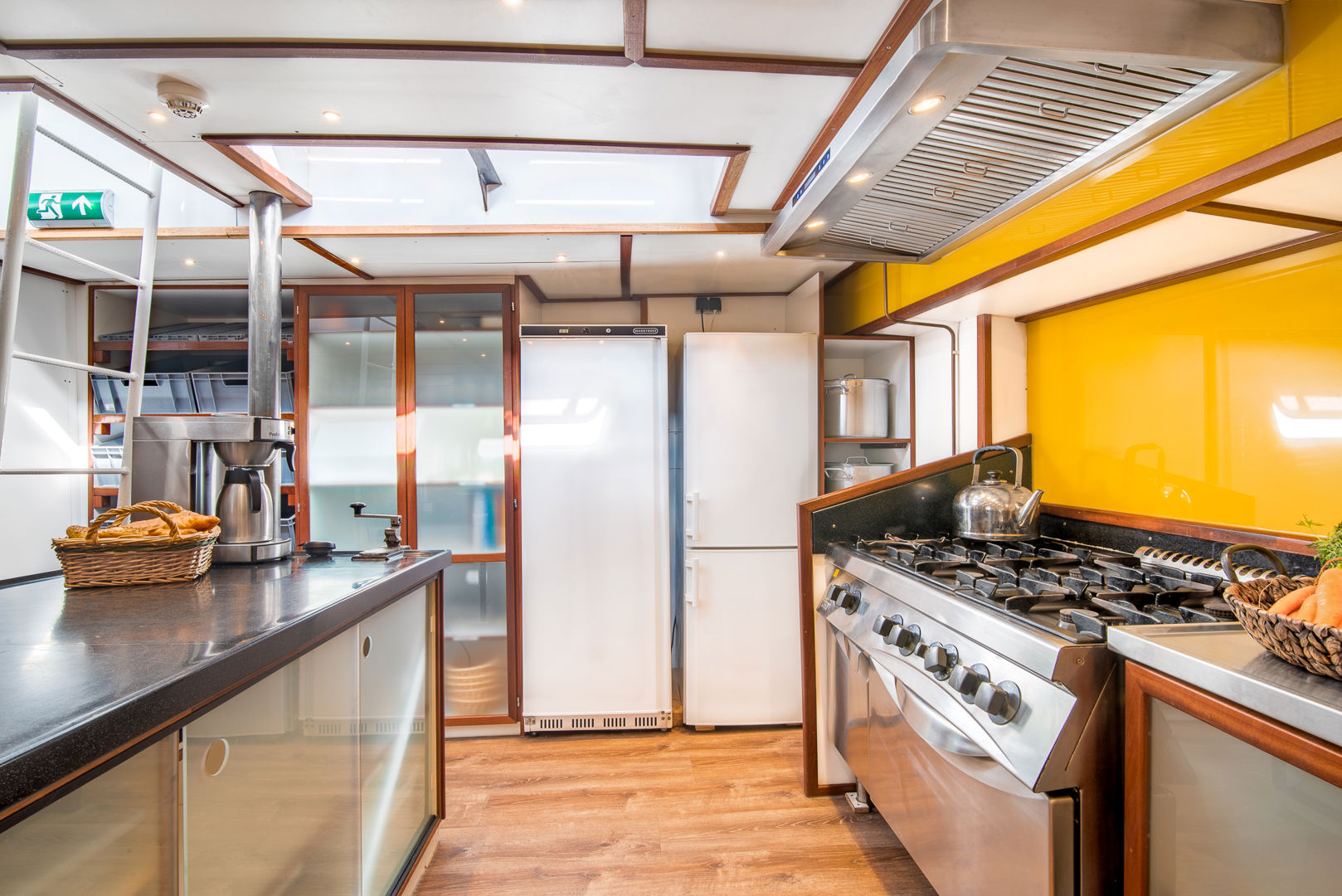 De grote kombuis (scheepskeuken) bevindt zich achter de salon. Hier heeft u alle ruimte de maaltijden voor uw groep te bereiden. De kombuis voorzien van alle gemakken, zoals een groot horeca-gasfornuis met oven, een grote koelkast, een vriezer en een vaatwasmachine.
