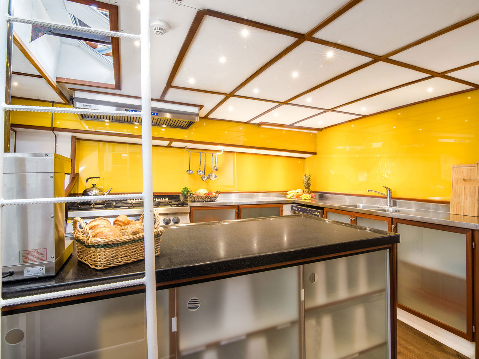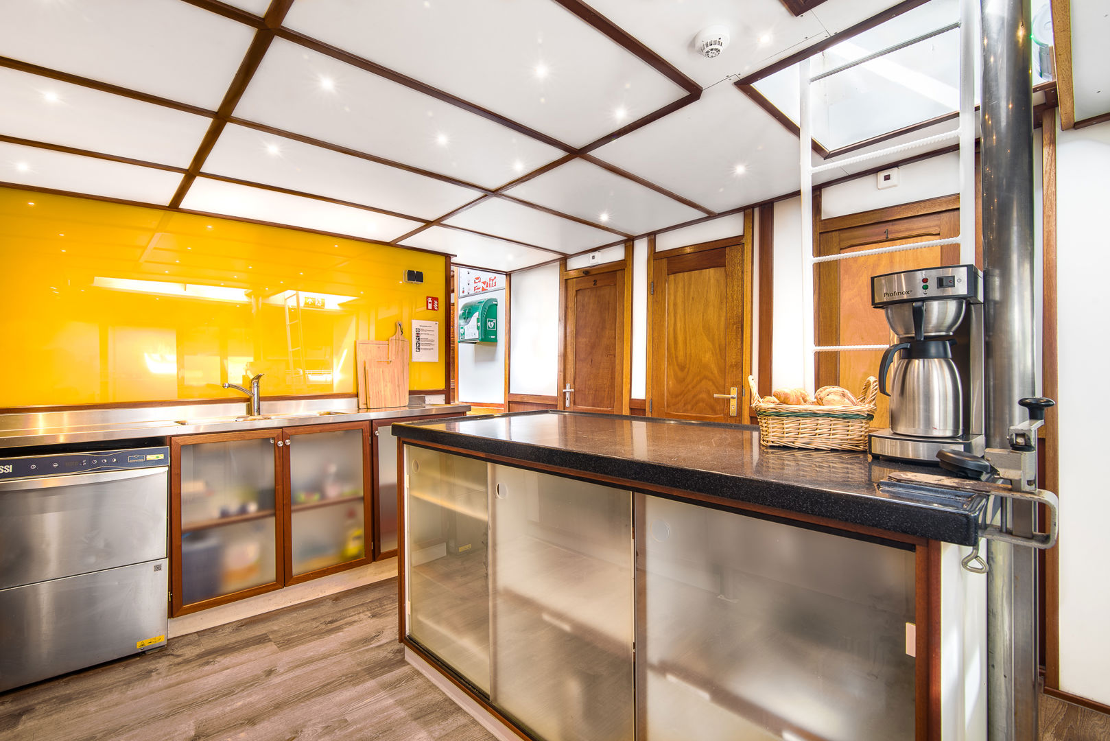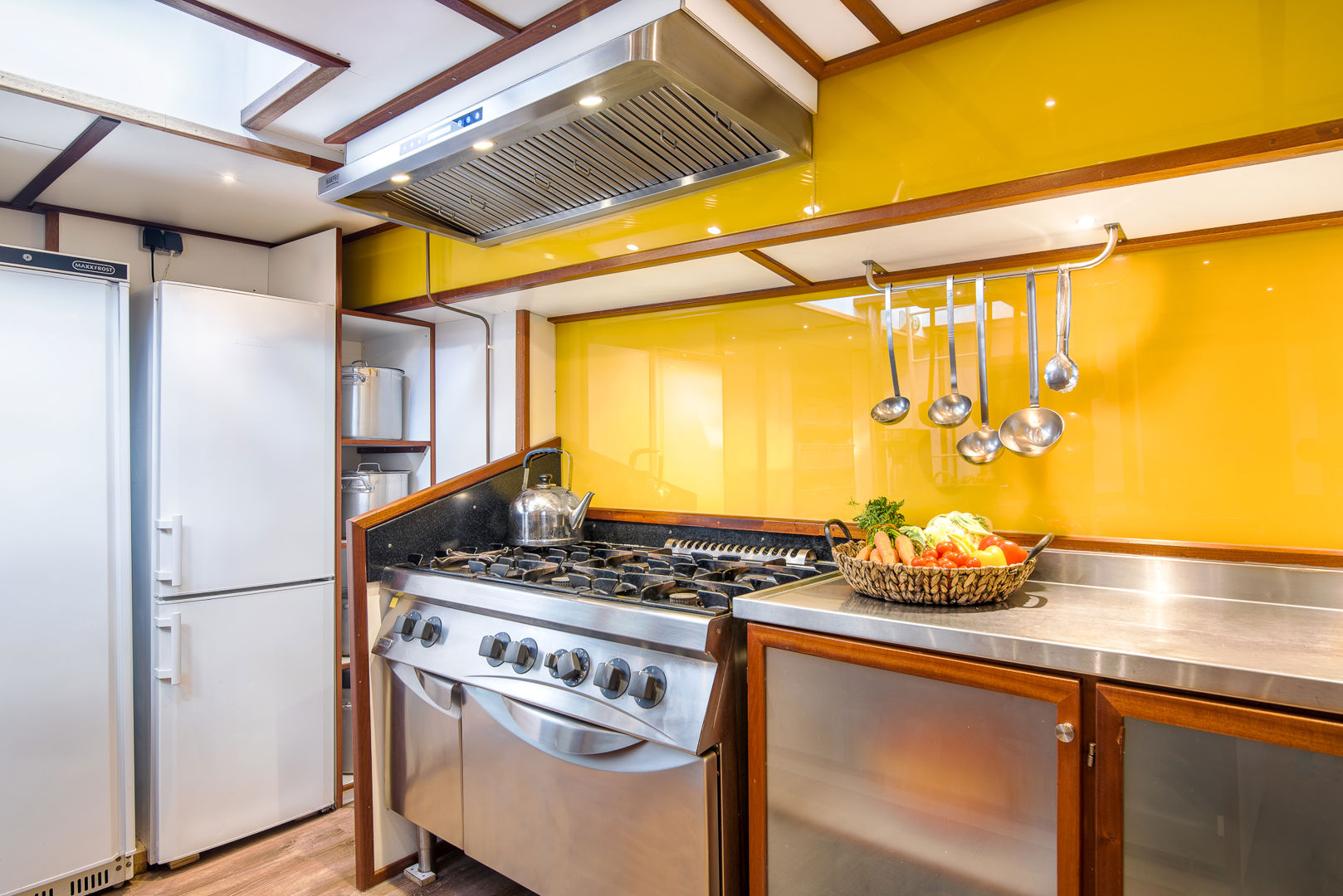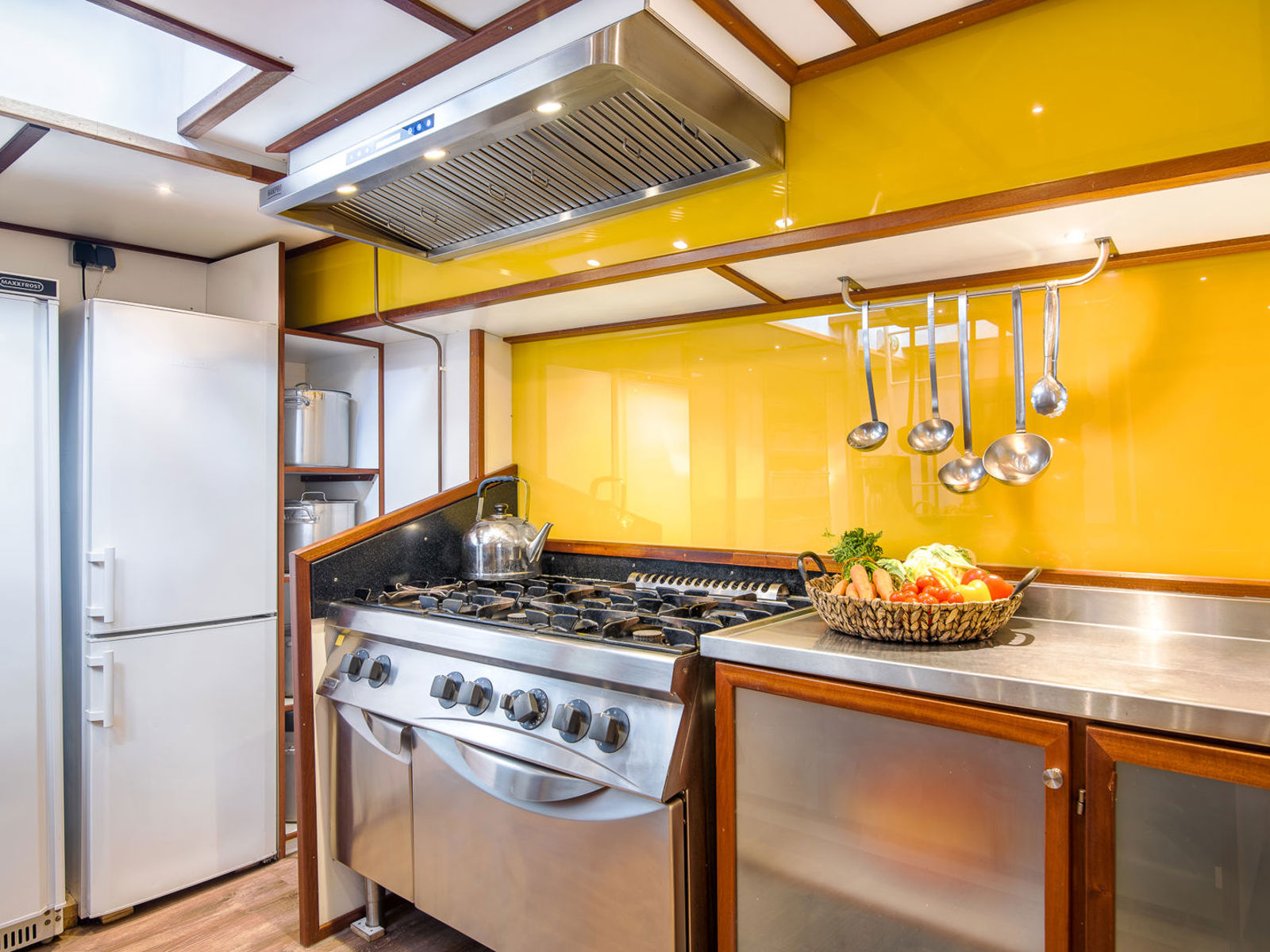 De grote kombuis (scheepskeuken) bevindt zich achter de salon. Hier heeft u alle ruimte de maaltijden voor uw groep te bereiden. De kombuis voorzien van alle gemakken, zoals een groot horeca-gasfornuis met oven, een grote koelkast, een vriezer en een vaatwasmachine.