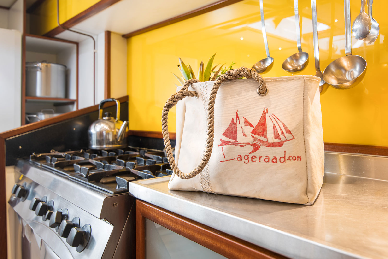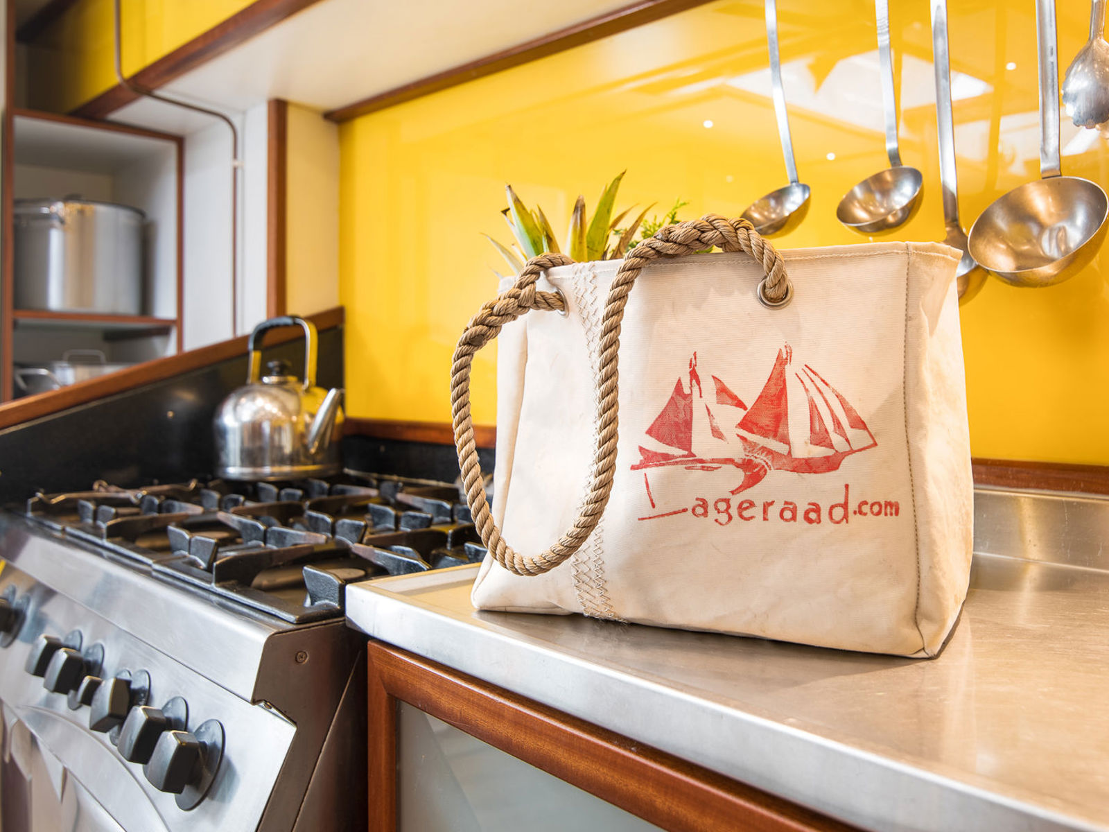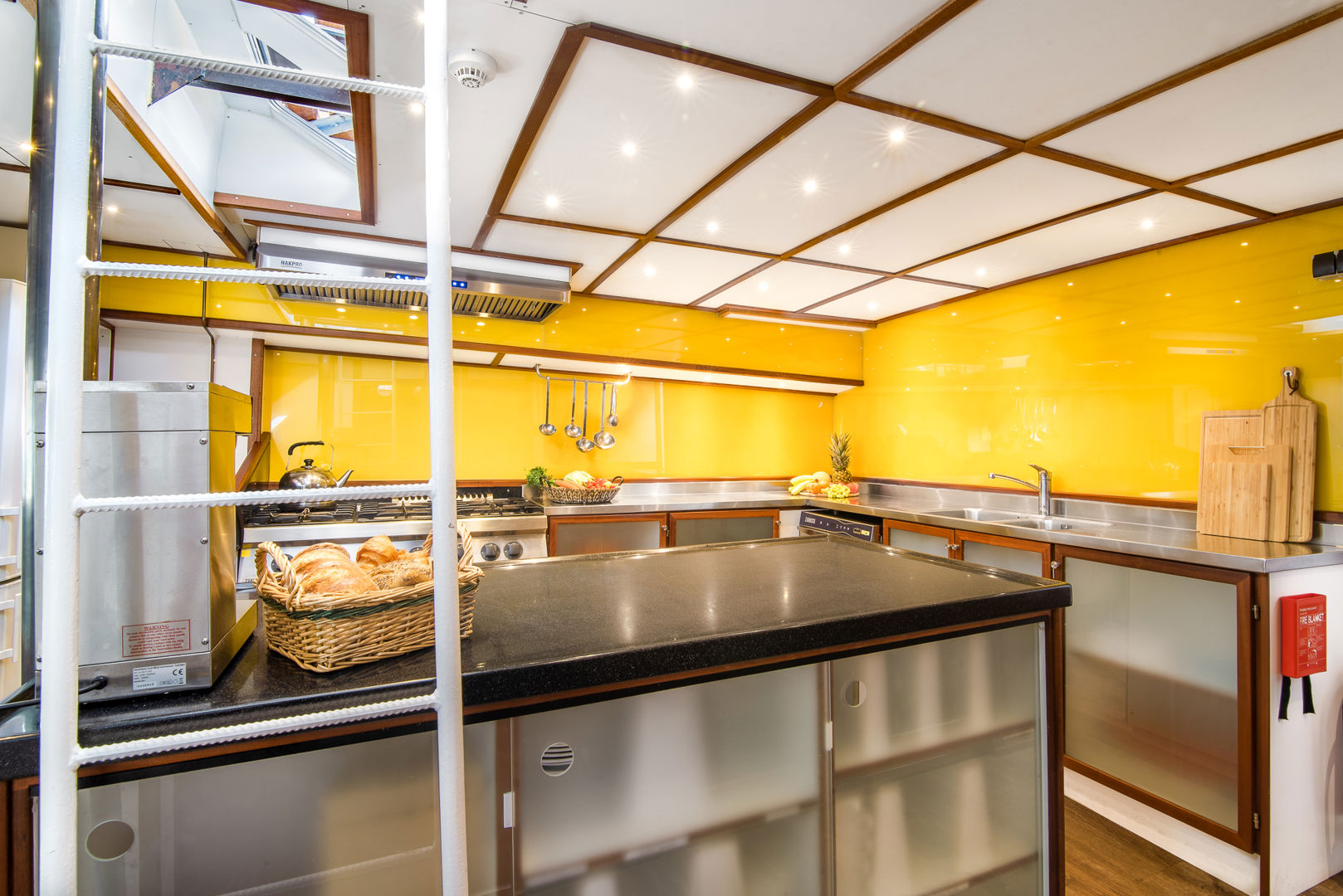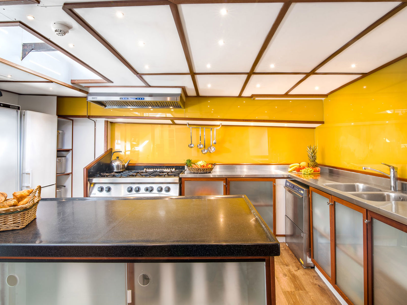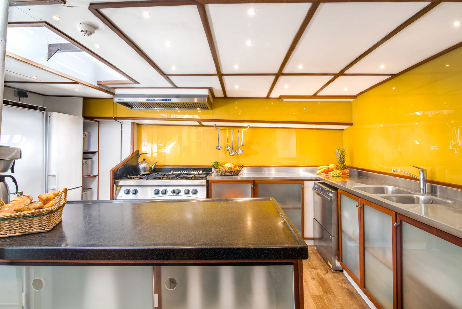 De grote kombuis (scheepskeuken) bevindt zich achter de salon. Hier heeft u alle ruimte de maaltijden voor uw groep te bereiden. De kombuis voorzien van alle gemakken, zoals een groot horeca-gasfornuis met oven, een grote koelkast, een vriezer en een vaatwasmachine.