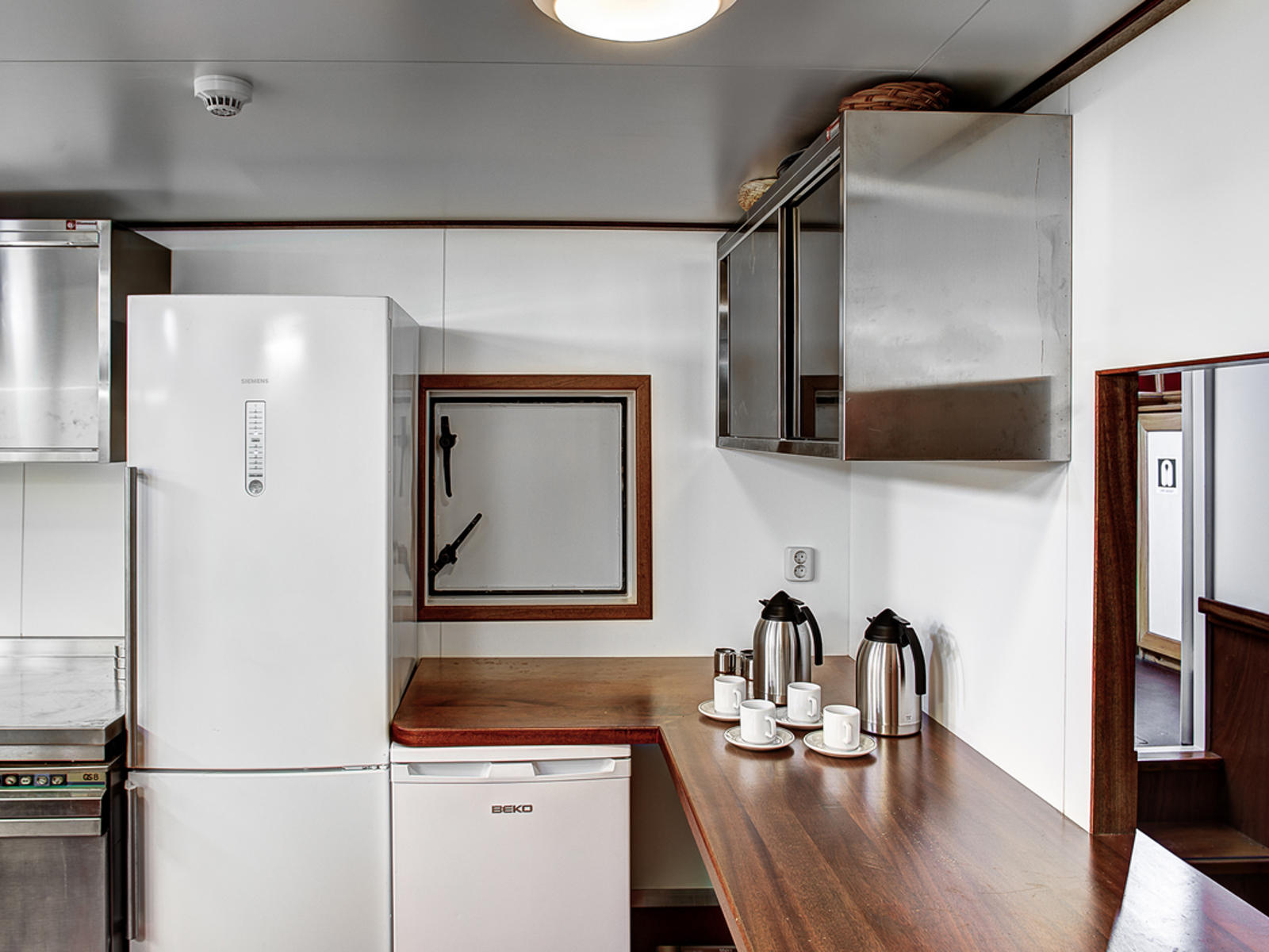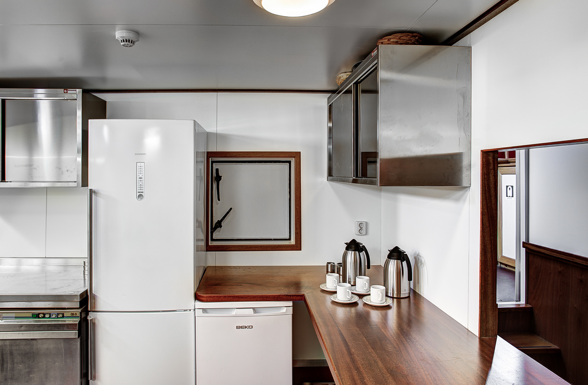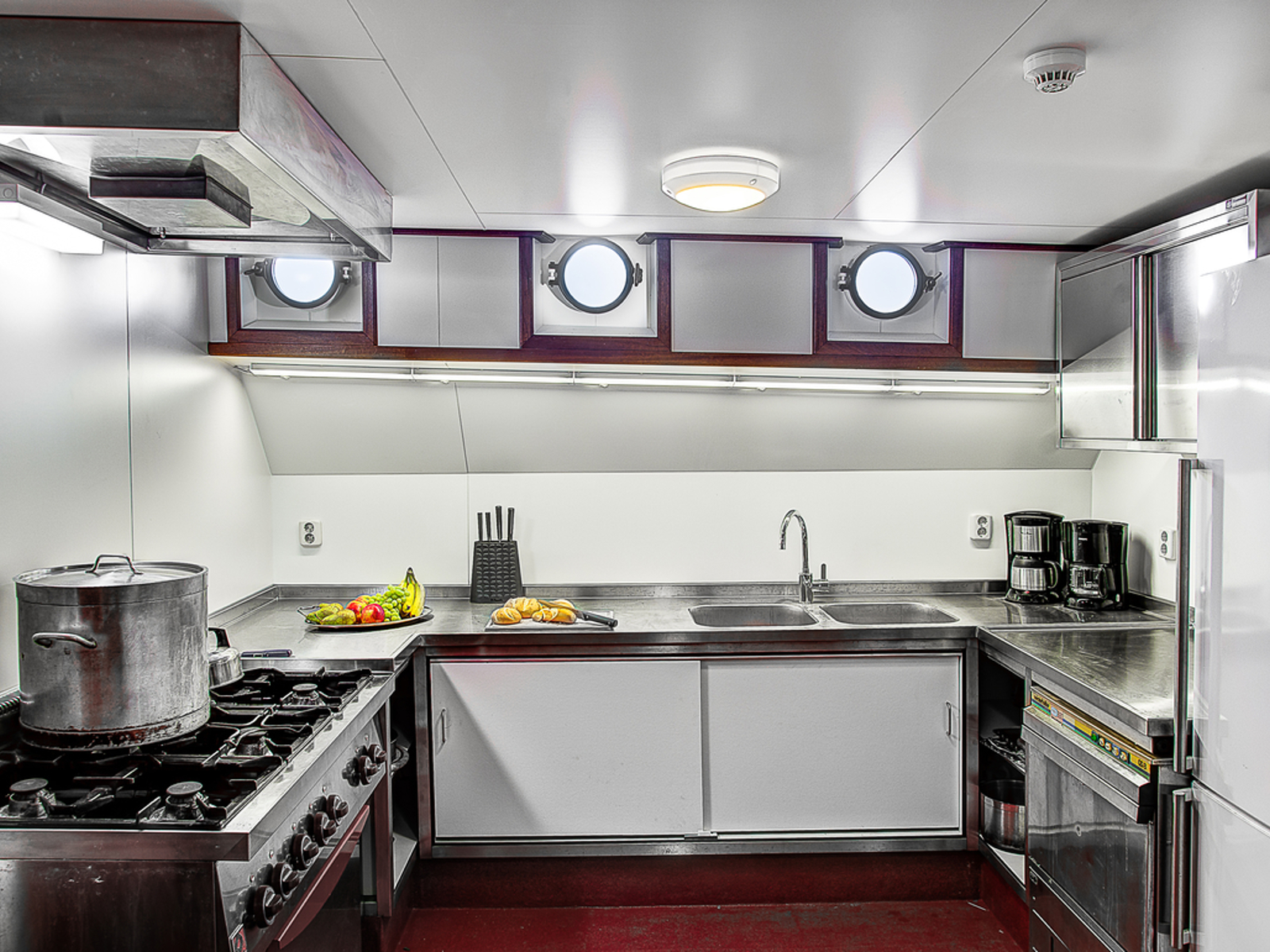 Het schip beschikt over een grote horeca-keuken. Hierin vindt u een gasfornuis met 6 kookplaten en oven, een grote koelkast en een vriezer, een gastronomie vaatwasmachine en een koffiezetapparaat.