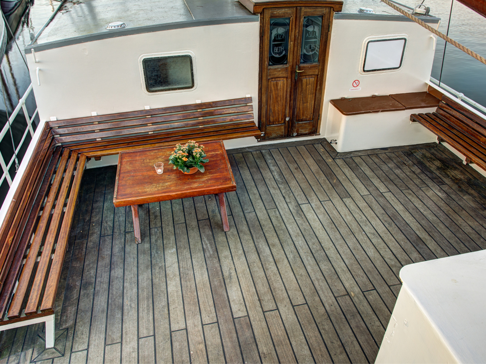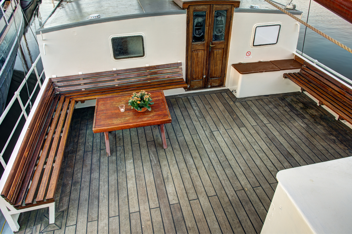 Vanuit de salon bereikt u via een brede trap de zithoek aan dek, waar u tijdens de zeiltocht heerlijk kunt zitten en van het prachtige landschap kan genieten.