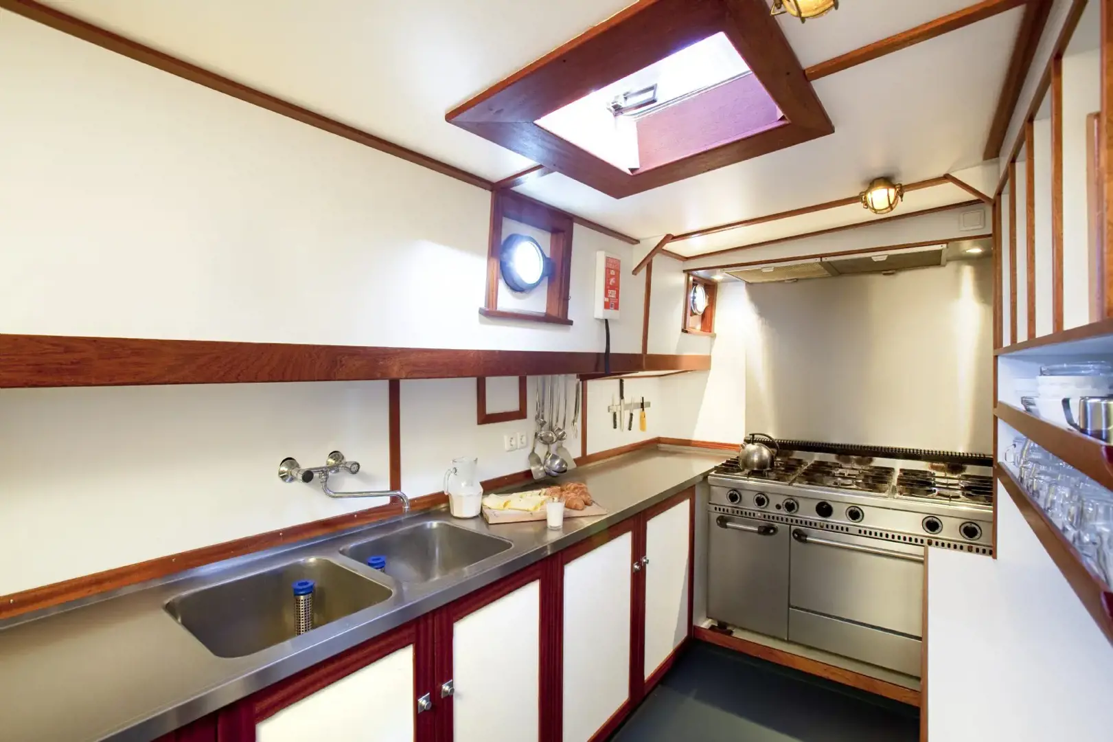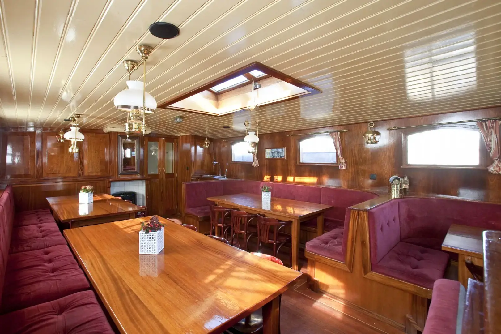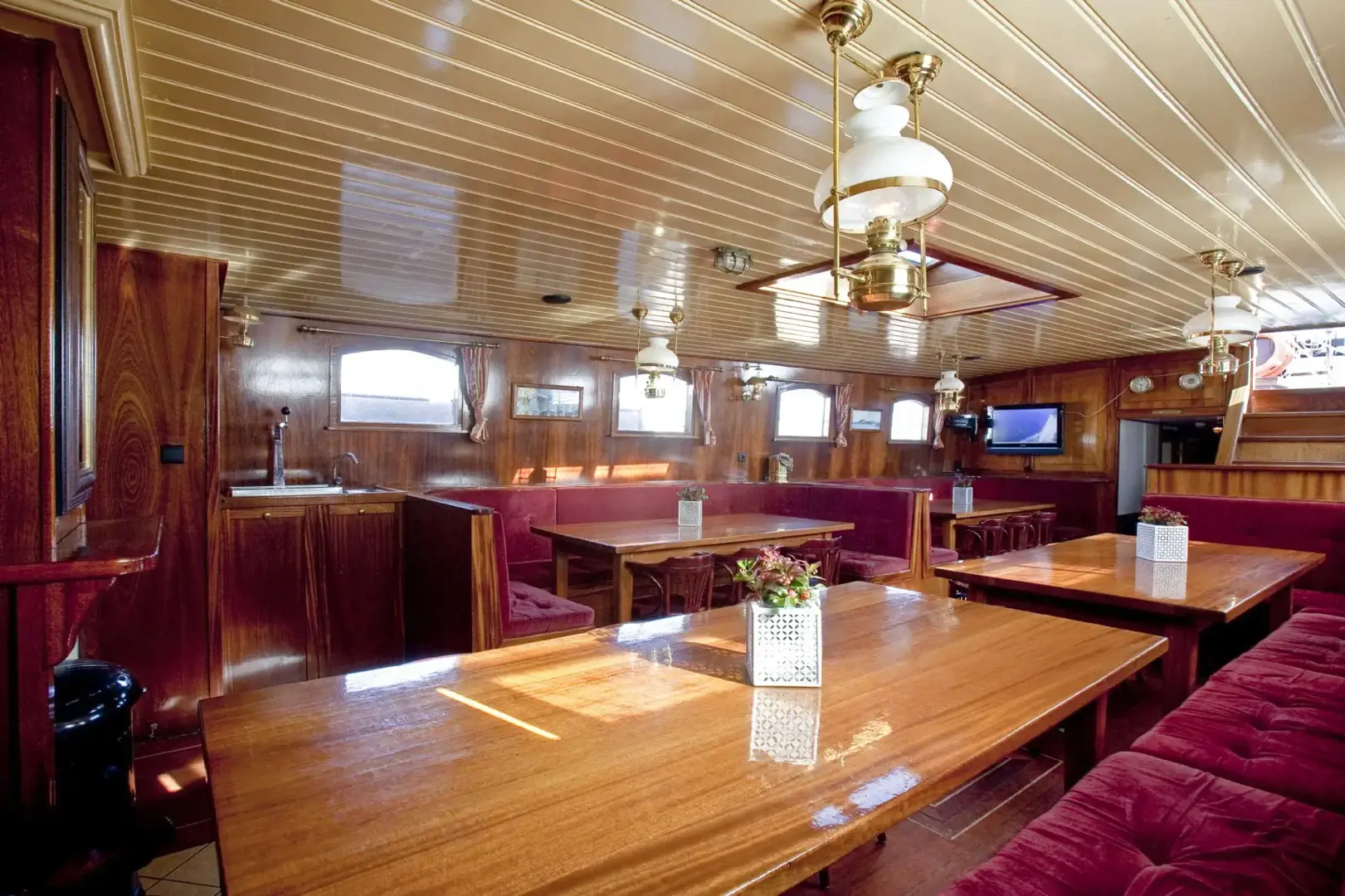 Aan de vier grote eettafels met banken en losse stoelen is voldoende zitgelegenheid voor 34 personen. Aan boord aanwezig is een flatscreen televisie, een dvd-speler en een stereo installatie.