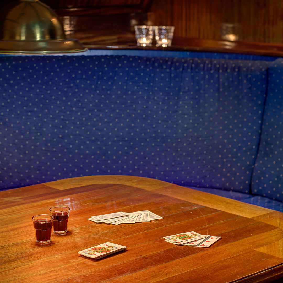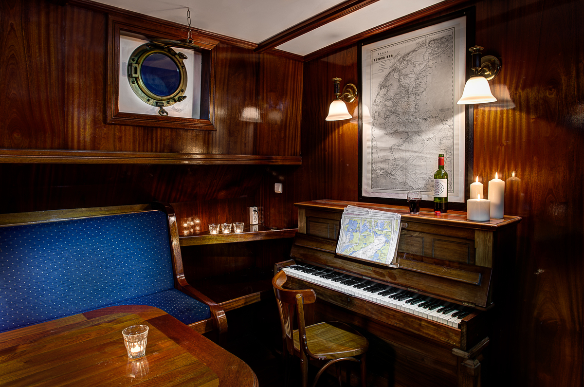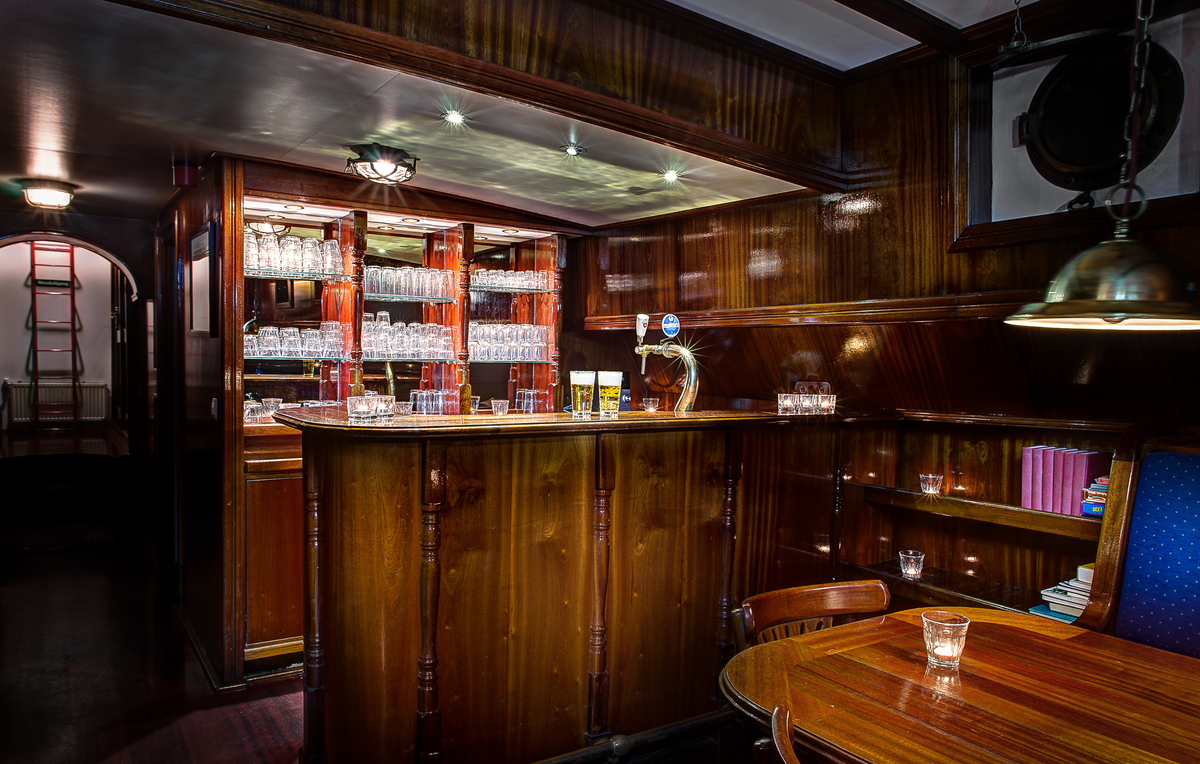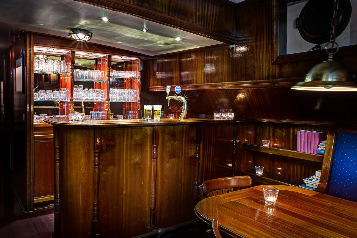 De gezellige salon met de mahoniehouten betimmering, bar en piano straalt de sfeer van verre landen en vervlogen tijden uit. De knusse salon heeft vier grote tafels met rondom zitmogelijkheden. Deze bieden voldoende ruimte voor 34 personen. De gezellige bar heeft een tapinstallatie voor Lage Landen bier. Deze kunt u via kantoor bestellen. De toogkast geeft de bar een luxe uitstraling.