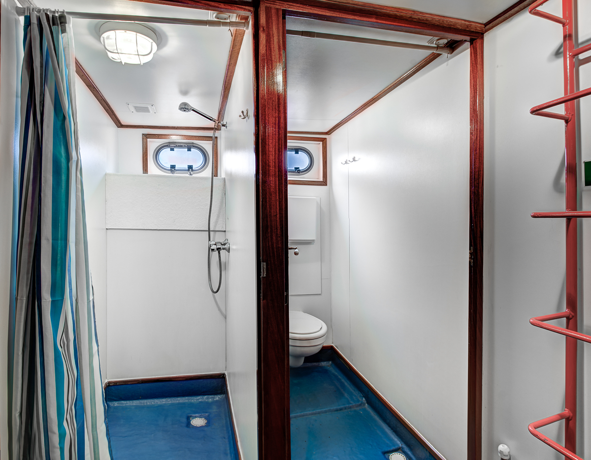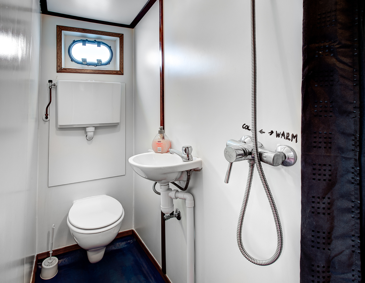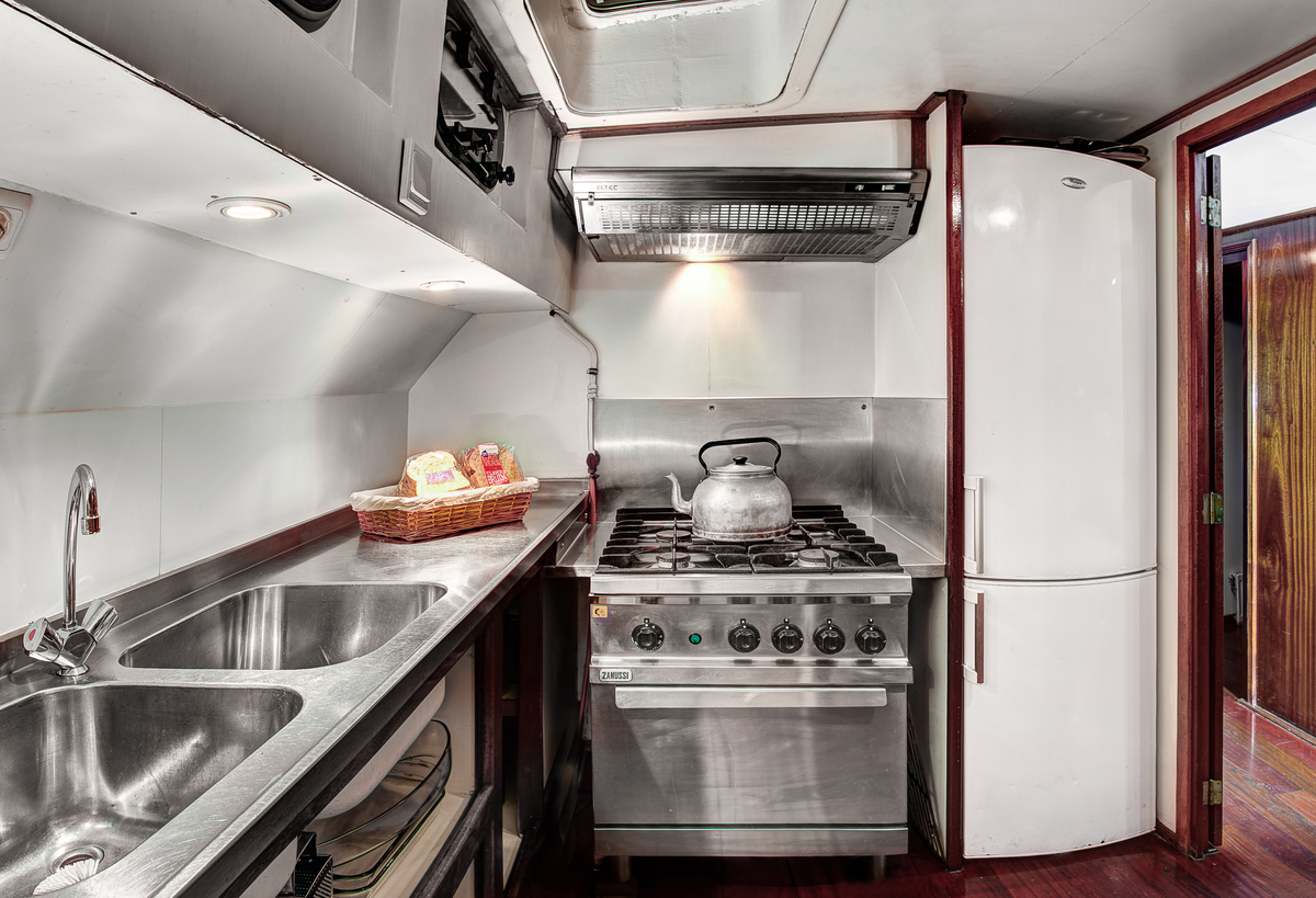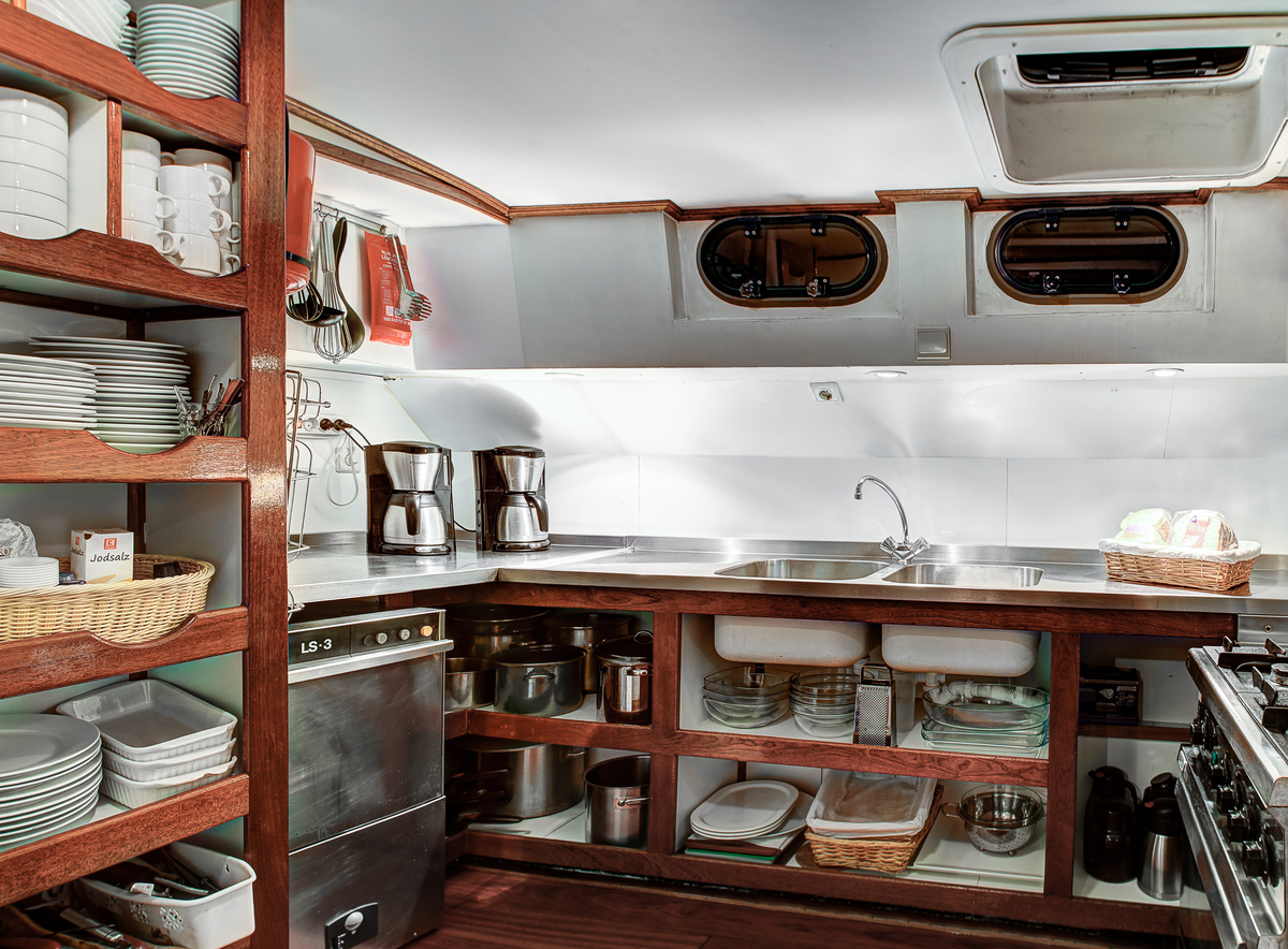 In het achterschip bevindt zich de kombuis. Deze is compleet ingericht met een grote koelkast met diepvriesruimte, een gasfornuis met 5 branders en een grote oven, een horeca vaatwasmachine en voldoende serviesgoed voor de gehele groep.