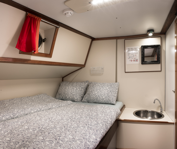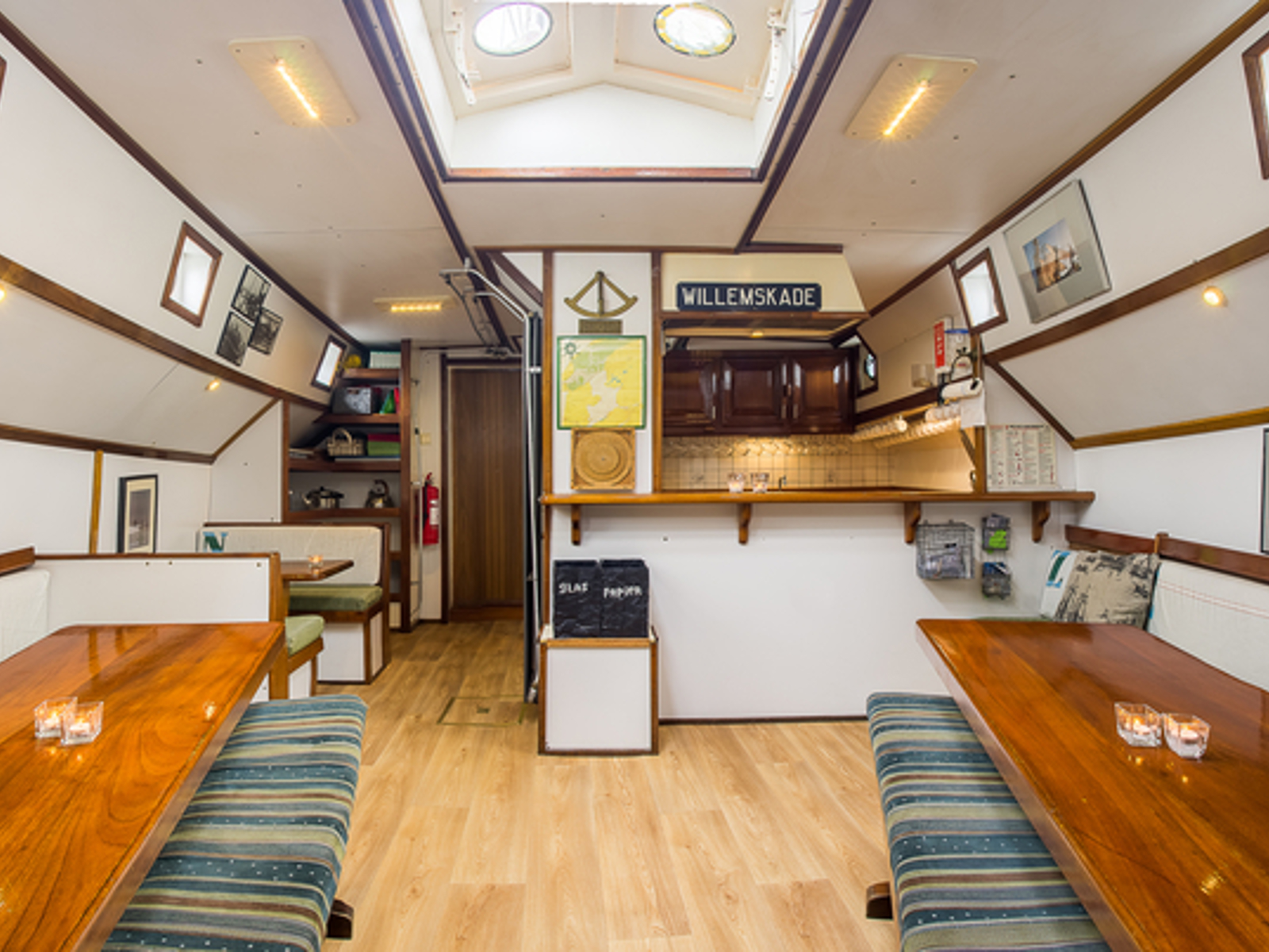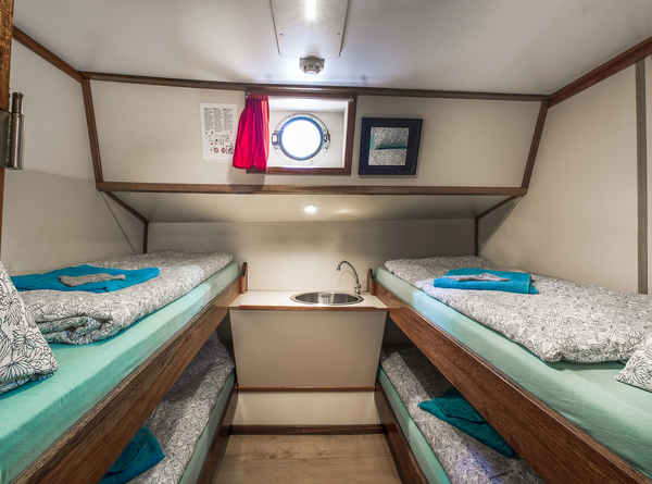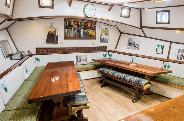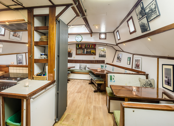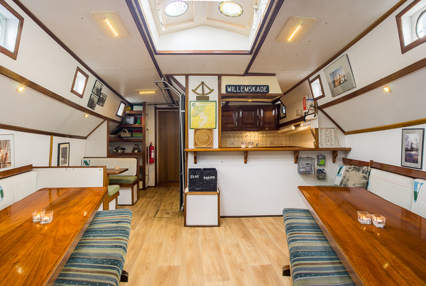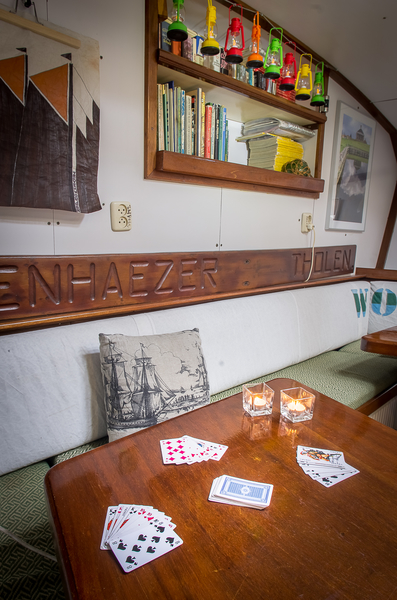 De Zeven Wouden - een sierlijke tweemastklipper - beschikt over een gezellige, lichte salon. Langs de wanden zijn lange banken met kussens. U vindt hier twee grote lange tafels, die apart van elkaar gebruikt kunnen worden. Maar u kunt deze tafels ook tegen elkaar schuiven, zodat er één grote tafel is. Bovendien is er in de salon nog een zogenaamde dinette, een vaste tafel met aan beide zijde een vaste bank. U vindt dus in de salon altijd een plekje voor een gezellig gesprek, een gezelschapspelletje of gewoon rustig zitten voor het lezen van een boek.