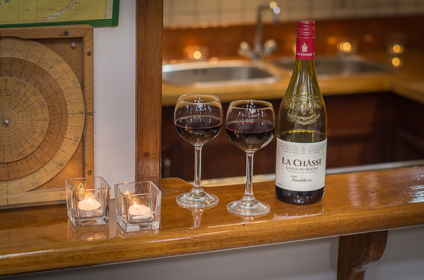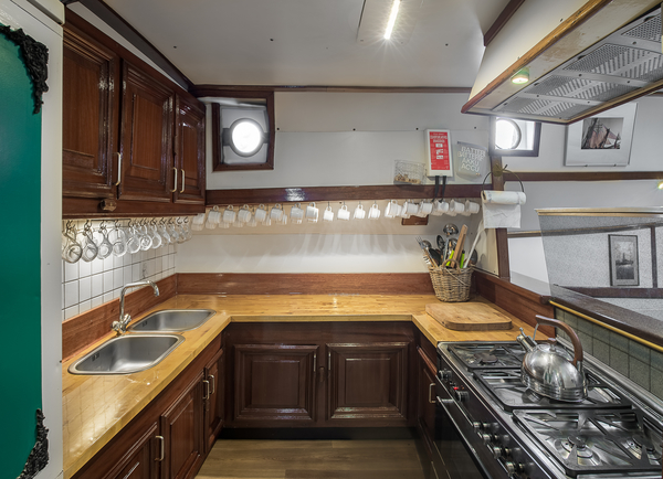 De kombuis (scheepskeuken) is compleet uitgerust en nodigt uit voor de bereiding van een maaltijd. Vanuit de keuken heeft u direct contact met de mensen in de salon.